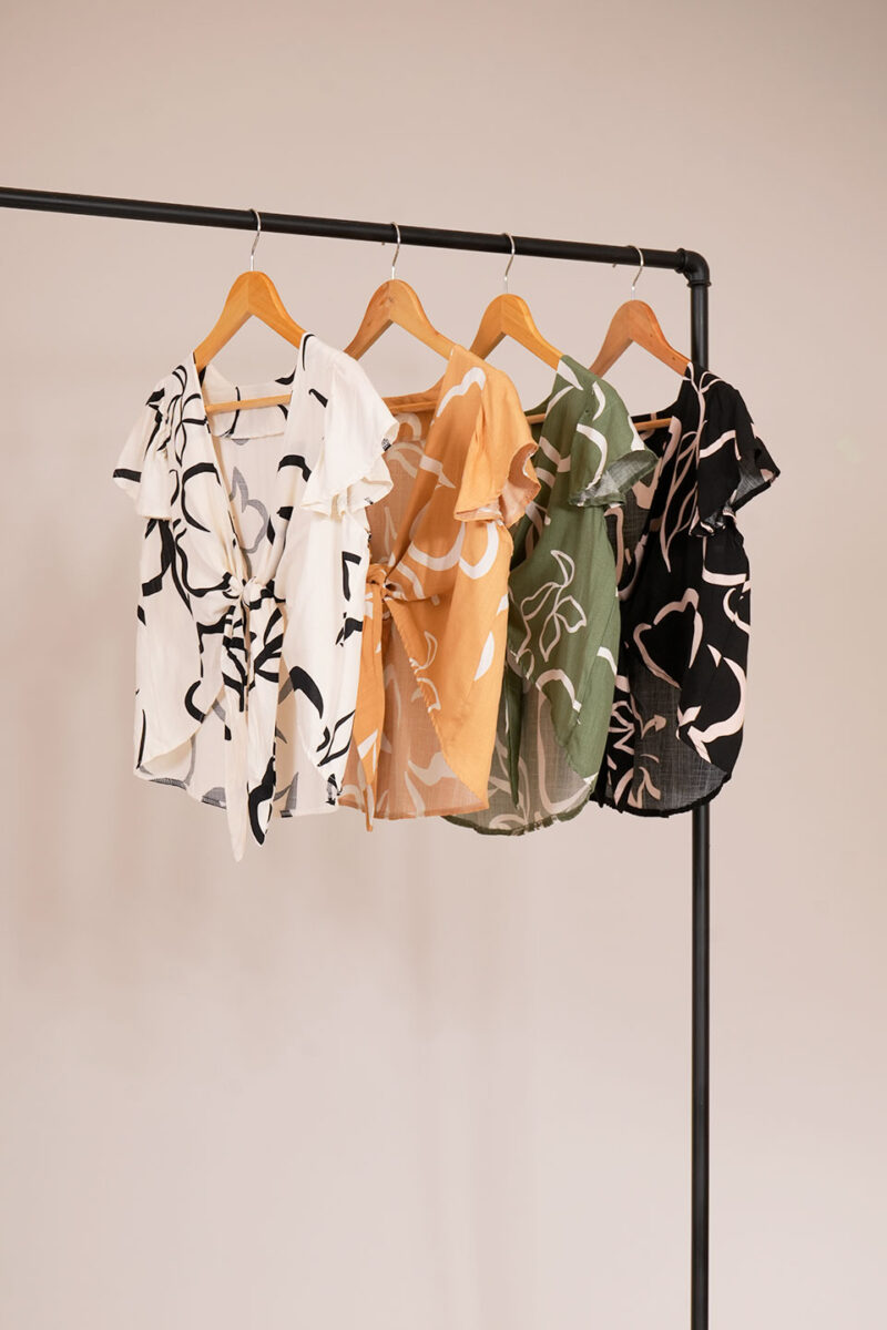 Top Lino Estampado Volados En La Manga Para Atar Gilda