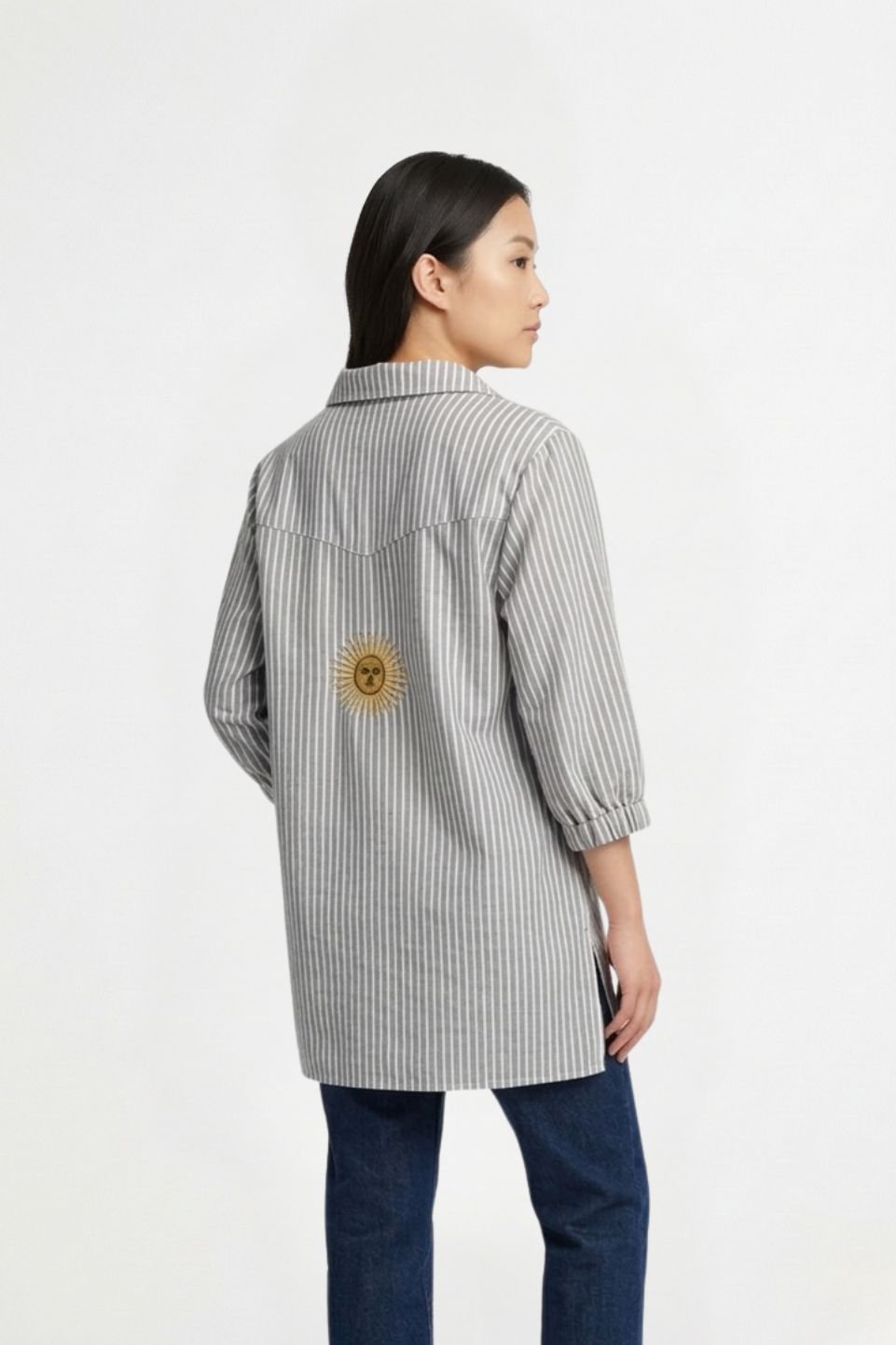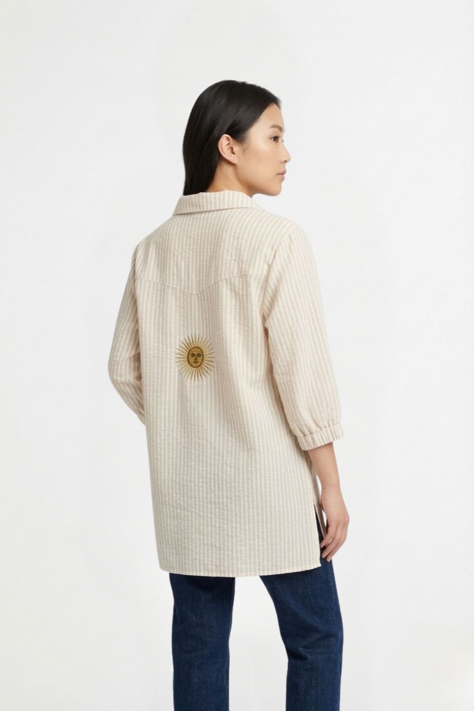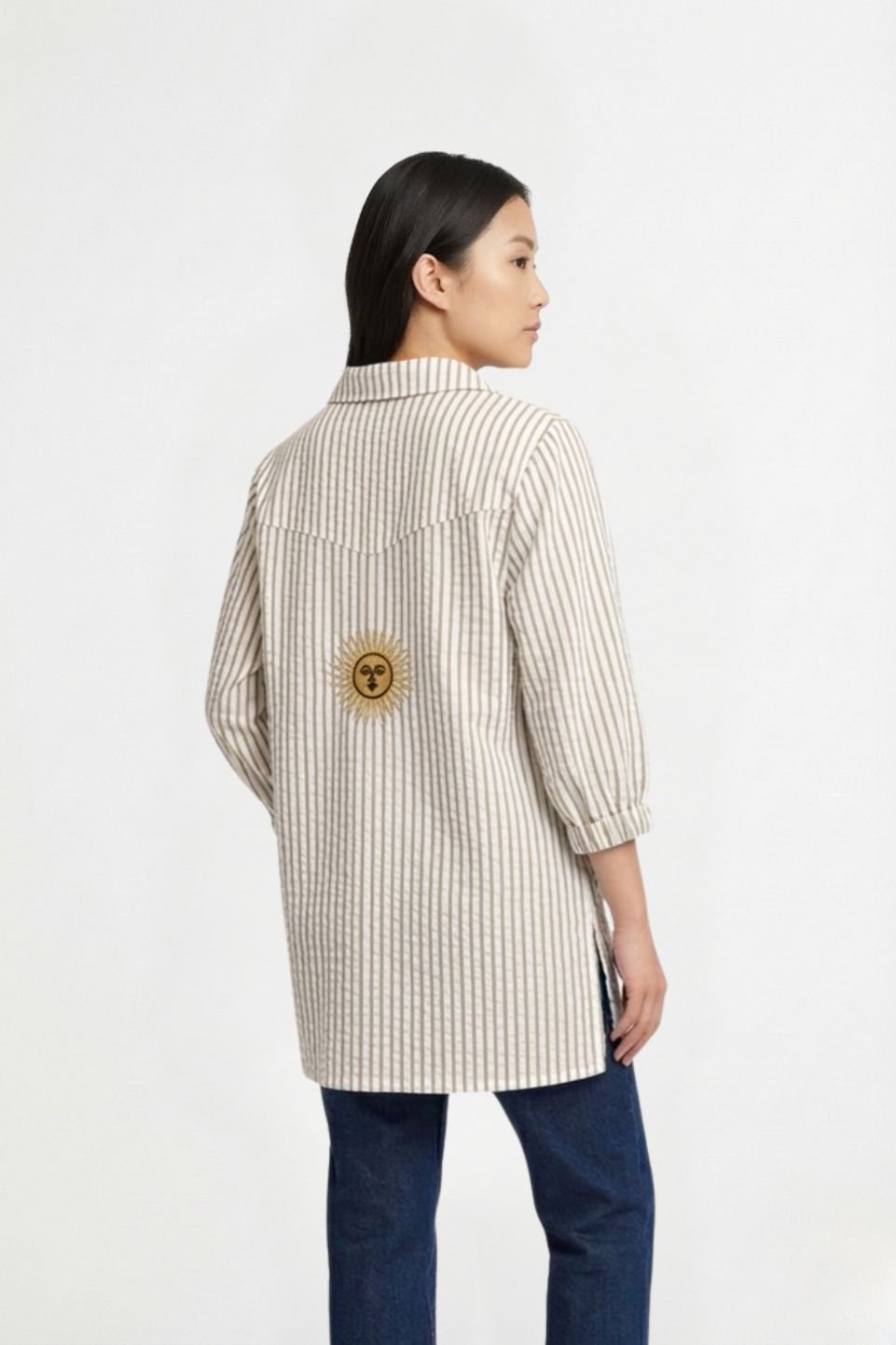 Camisa Larga Lino Rayado Manga Fruncida Sol Bordado «DELTA»