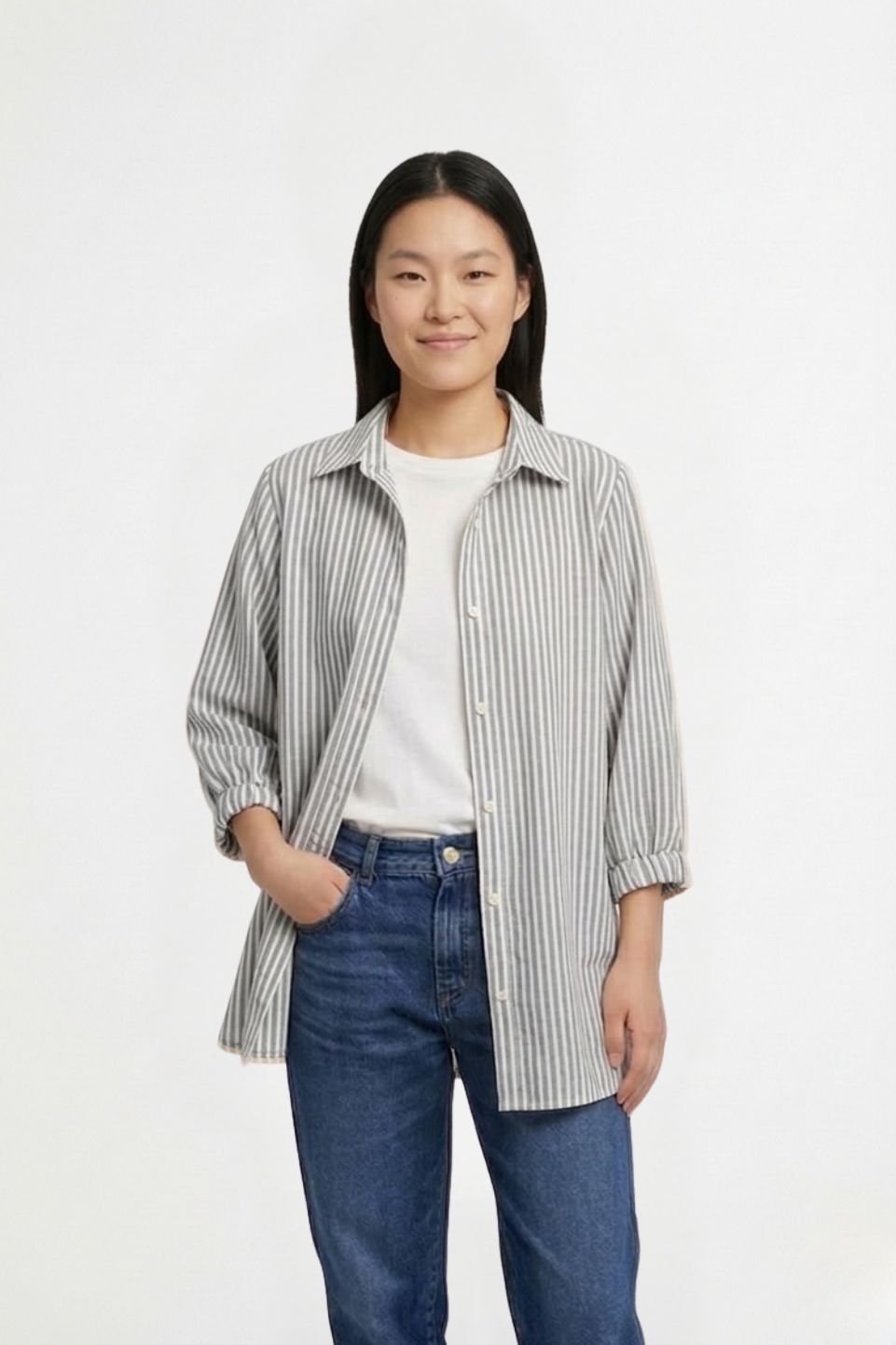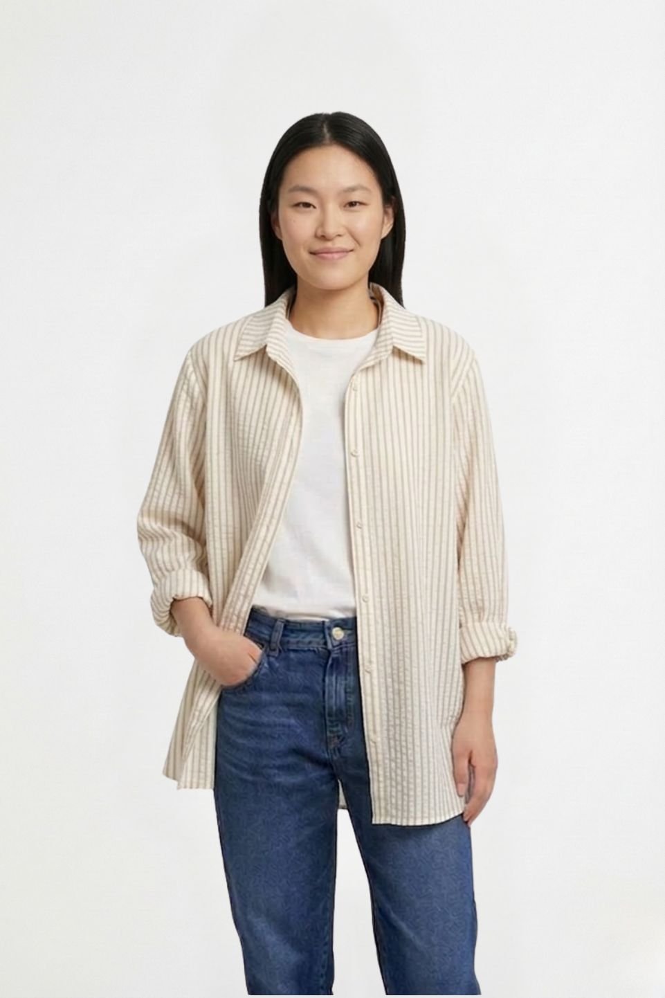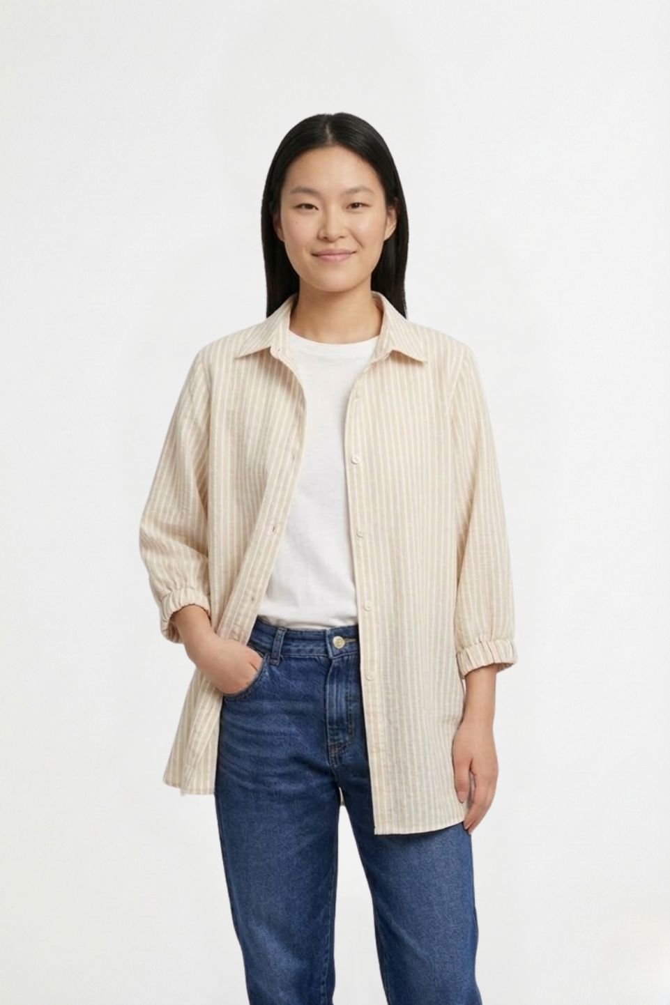 Camisa Larga Lino Rayado Manga Fruncida Sol Bordado «DELTA»