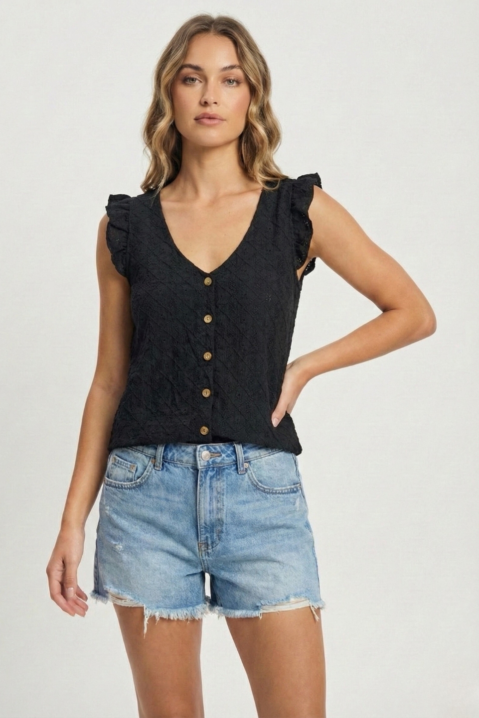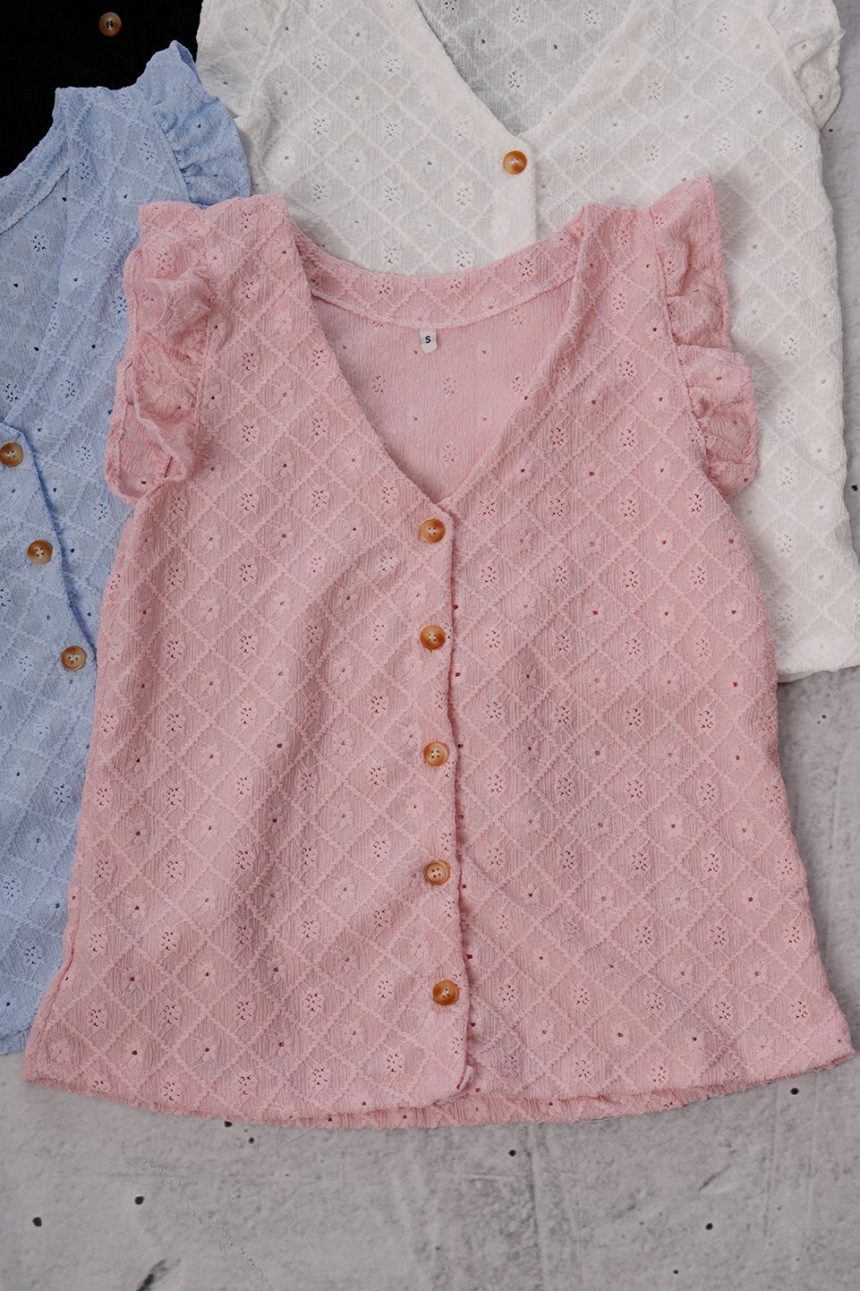 MUSCULOSA VOLADO CON BOTONES BRODERIE CREP S-M-L rombos chiquitos ANP