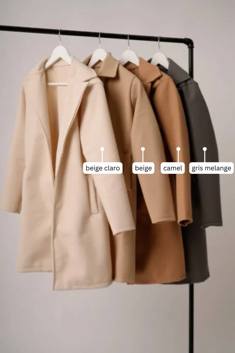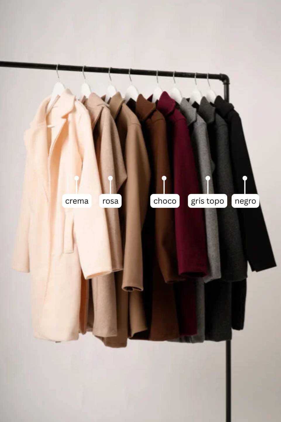 | Color | Beige, Beige Claro, Bordo, Camel, Chocolate, Crema, Gris Melange, Gris Oscuro, Gris Topo, Lila, Marron, Negro, Rosa, Vison |